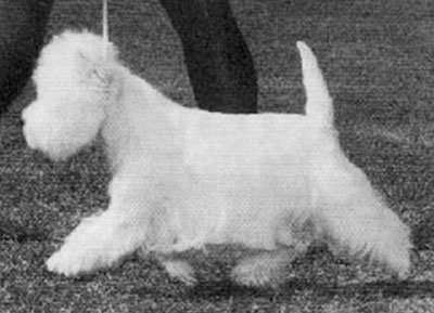 | The picture presented when a Westie has reach and drive. Notice the head is no higher than the 11 o'clock position, the topline is level, the one hock is drawn well under the body while the opposite hock is well opened. She is carrying her tail very well, showing a good set on. |