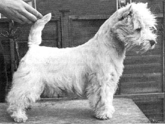 | This stylish bitch shows good overall balance. She displays a broad muscular neck, despite the hair built up over the withers. Her back looks short partially due to the grooming. She has a nice short, straight tail. The legs are stretched a tad too far back. | This is the same bitch as seen in the previous photo. Here her balance is somewhat off due to the neck looking too long, as a result of the photo angle. Also, her back looks shorter here due to the angle of the tail. | This very feminine Westie shows the forechest desired. Her body proportions are acceptable. I'm not sure if the neck is really thin, poorly groomed, or as a result of the photo angle. I suspect it is the latter. |